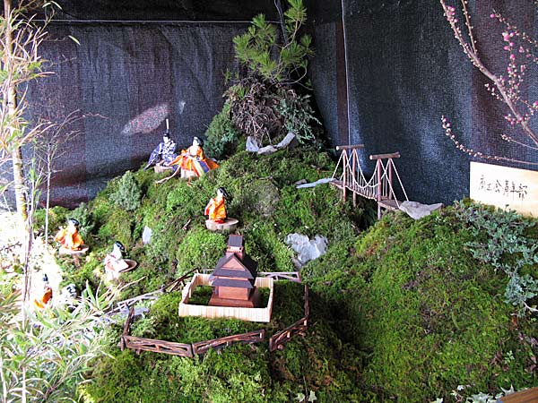 決して豊かではない生活の中で、女の子が生まれると親戚や隣近所の人たちが、粘土で土人形や木の枝で木製の人形などを作り、山や川で拾ってきた巨木や古木、奇岩、輝石を飾り付け、花木などを持ち寄って奥座敷に山の神が住む風景を再現したものが「ひな山」の始まりであると伝えられています。